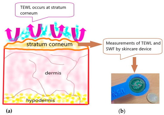 The human body’s skin can be divided into three depending layers: the hypodermis layer, the overlying dermis and the epidermis. The epidermis is the outermost layer of our skin, comprising the inner and outer parts. The outer part is called the stratum corneum (SC) [1] (Figure 1). SC initiates the skin moisture; therefore, it is required to determine the level of skin hydration and other parameters related to its health. Previously, multimodal sensors with soft, ultrathin and skin-like formats were developed for monitoring the hydration level of the skin [2]. Similarly, a wireless epidermal sensor based on passive inductive coupling was reported [3], where the analyzer was connected to a hand-wound copper primary coil, used to measure the hydration of the skin. Recently, an ultra-thin, tape free e-tattoo type sensor was designed, which could measure three features from the human skin, i.e., an electrocardiogram (ECG), the skin temperature and the skin hydration [4]. Similarly, a machine-learning-based noninvasive solution has been purported that uses galvanic skin response (GSR) to detect the hydration level in the human body [5]. The measurements of the transepidermal water loss (TEWL) and the skin wettedness factor (SWF) have been given significant importance in many research areas like dermatology, pharmacology, clinical analysis and cosmetic science. In addressing dry skin problems, one could obtain information about the TEWL rate from the skin, in order to make a choice in selecting relevant cosmetic products. However, individual assessments based on feeling are too subjective, which is why SWF is used to actually determine the human skin comfort level [6]. A portable tester giving information about the TEWL and the SWF could be conveniently used at home or outside to provide guidance in the selection of cosmetics. For instance, when showering and bathing, the proper kinds of soap or shower foam must be chosen according to the individual’s skin status, which could make the TEWL be low throughout the day.