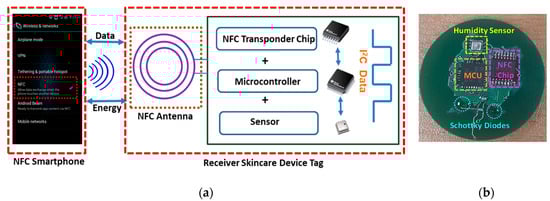 (a) Overall structure of the battery-free smart skincare sensor device tag system; (b) main components of the skincare device tag.