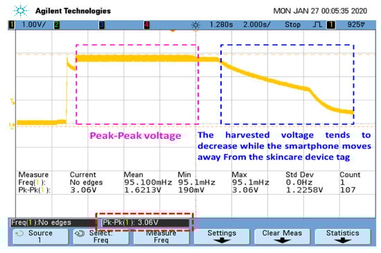 The fabricated smart skincare device tag measured 2.6 cm in diameter (Figure 3a) and was enclosed on a flexible 3D-printed object (Figure 3b), enabling it to operate fully and conveniently in a passive mode. This lightweight 3D flexible structure made the device more convenient to take outside, especially for those people who are often quite anxious when it comes to the usage of any skincare device. The operating distance for energy harvesting from the NFC-enabled smartphone was approximately 1 cm (Figure 3c), making the skincare device tag work efficiently on battery-less techniques. The energy harvesting efficiency depends on a number of factors, including the antenna dimensions. In our case, the six-turn coil antenna embedded on the skincare device tag had the following dimensions: thickness of each turn coil: 0.02 cm; total inner radius of the circular coil antenna: 1 cm; and total outer radius of the circular coil antenna: 1.25 cm. The maximum harvested energy was measured with an oscilloscope (DS07054A, Tektronix Inc., Beaverton, OR, USA). The peak–peak (Pk–Pk) harvested voltage was 3.06 V when the smartphone was brought very close to the skincare sensor tag device (~1 cm); however, it gradually decreased as we started moving the smartphone away from the skincare device tag (>1 cm) (Figure 4).