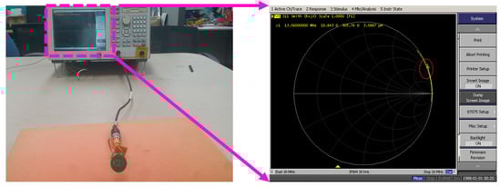 For the skincare device to operate effectively and efficiently, the six-turn coil antenna was first designed and tested on a well-known magnetic simulator (Ansoft Maxwell, ANSYS Inc., Canonsburg, PA, USA) to study the electromagnetic simulations. The inductance (3.5887 µH) of the fabricated antenna coil on the device was then measured with a network analyzer (E5062A, Agilent Technologies Inc., Santa Clara, CA, USA) (Figure 5) to determine the tuning capacitor (C = 1/4π2f2L = 38.38 × 10−12 ≈ 38 ρF) that should be soldered on the fabricated PCB for proper tuning at the desired frequency (13.56 MHz). More importantly, before finding the coil inductance, all the components were properly soldered on the FR4 substrate to ensure that all the parasitic capacitances and inductances, which might affect the result of finding the inductance of the skincare device coil, were also added.