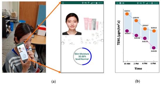 Moreover, an android application was developed to save skin moisture and skin temperature sensing values in an android smartphone. The app could comprehensively and easily provide the history of the calculated TEWL and SWF values for the user.