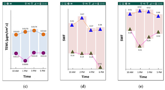 A smart skincare app was designed on the android platform. This app could display the percentage values of the skin moisture taken from the sensor in a circular bar, as well as the skin moisture level (Figure 6a). After taking the skin moisture sensor readings, the values were processed to calculate the corresponding TEWL and SWF values. In android, waterfall graphs with the trendline were later displayed to show the history of the maximum and minimum values of TEWL and SWF in the indoor and outdoor environments, registered at different times of the day. The highest TEWL value noted at 10 AM in indoor environment among the eight subjects was 0.0215 µgm/cm2·s, while the lowest one was 0.0162 µgm/cm2·s (Figure 6b). Similarly, at 2 PM, 4 PM and 6 PM, the highest (lowest) TEWL readings recorded in the android smartphone were 0.0193 µgm/cm2·s (0.0148 µgm/cm2·s), 0.0167 µgm/cm2·s (0.0139 µgm/cm2·s) and 0.0163 µgm/cm2·s (0.0109 µgm/cm2·s), respectively, in the indoor environment (Figure 6b). The same process was repeated for the outdoor environment, illustrating the highest (lowest) TEWL readings at 10 AM, 1 PM, 3 PM and 5 PM to be 0.0163 µgm/cm2·s (0.0117 µgm/cm2·s), 0.0170 µgm/cm2·s (0.0099 µgm/cm2·s), 0.0174 µgm/cm2·s (0.0119 µgm/cm2·s) and 0.0164 µgm/cm2·s (0.0119 µgm/cm2·s), respectively (Figure 6c). The TEWL trendline followed a decreasing fashion in the indoor environment. In contrast, an increasing trend, especially during the afternoon times, was observed in the outdoor environment because most of the subjects felt sweaty during that period. The same process was repeated for the SWF calculations. The highest (lowest) SWF values recorded at 10 AM, 2 PM, 4 PM and 6 PM for the indoor environment were 0.41 (0.16), 0.47 (0.14), 0.37 (0.14) and 0.38 (0.01), respectively (Figure 6d). Meanwhile, the highest (lowest) SWF values recorded at 10 AM, 1 PM, 3 PM and 5 PM for the outdoor environment were 0.51 (0.35), 0.53 (0.21), 0.52 (0.29) and 0.48 (0.32), respectively (Figure 6e). Figure 6c,e show that the TEWL and the SWF in the outside environment followed an almost similar trendline; that is, the higher the TEWL, the higher the SWF, and the lower the TEWL, the lower the SWF.