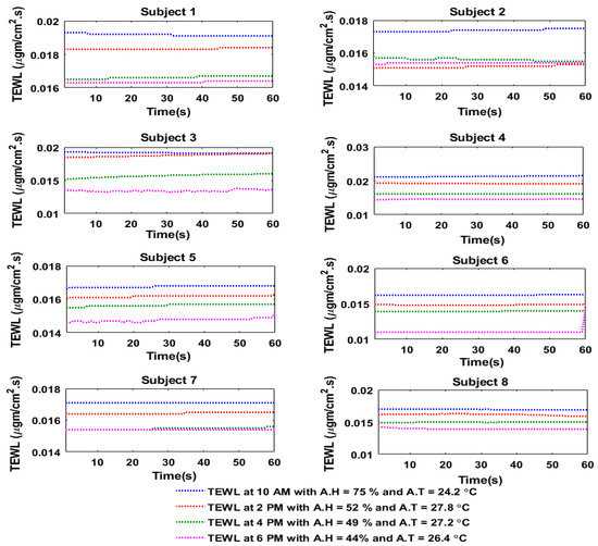 TEWL of the eight subjects at different times of the day during the indoor experiment.