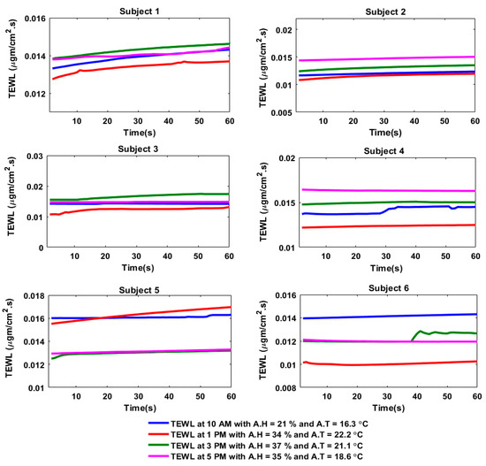 TEWL of the six subjects at different times of the day during the outdoor experiment.