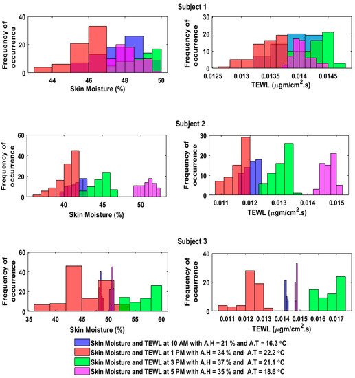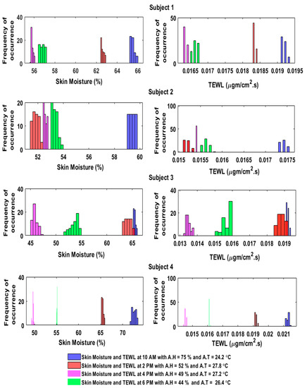 The sensor readings from the humidity sensor and the calculated TEWL values were then compared, and it was observed that the histograms in Figure 9 and Figure 10 depicted how the skin moisture and TEWL values followed the same trend (i.e., the higher the skin moisture, the higher the TEWL rate, and the lower the skin moisture, the lower the TEWL rate).