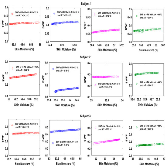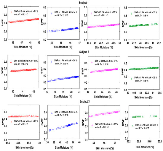 The sensor used in our experiment could also detect the skin temperature; therefore, the skin temperature and moisture are the key parameters for determining the SWF, using the following formula [40]: