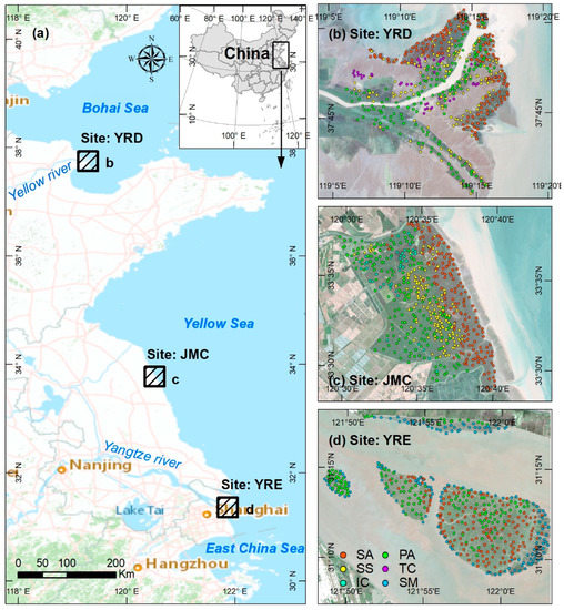 (a) Location map showing the three study sites, the Yellow River Delta (YRD), Jiangsu Middle Coast (JMC), and Yangtze River Estuary (YRE); (b–d) enlarged Sentinel-2 images of each study area highlighting the distribution of six dominant salt marsh vegetation samples in the YRD, JMC, and YRE. Note: SA = S. alterniflora, PA = P. australis, SS = S. salsa, TC = T. chinensis, IC = I. cylindrica, and SM = S. mariqueter.