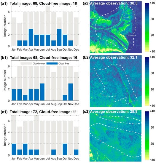 Improvements in the number of available observations from the pixel-differential time series. (a1–c1) Temporal distribution patterns of available observations from cloud-free images for the YRD, JMC, and YRE, respectively; (a2–c2) spatial distribution pattern of available observations from the pixel-differential time series for the YRD, JMC, and YRE, respectively.