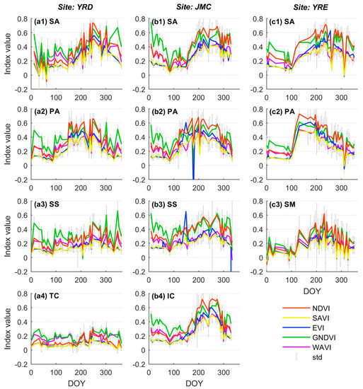 Concerning the same class of salt marsh vegetation, the trend for various VI time series is similar, and the differences primarily manifest in terms of time series amplitude and stability. Compared with the NDVI time series, the characteristics of the other VI time series can be summarized as follows. The amplitude of the GNDVI time series is close to that of the NDVI time series during the vegetation growing season (March to November) but significantly higher than that of the other VI time series during the dormant season (December to February) during which most of the conspicuous fluctuations appear (e.g., Figure 5(a2,a3)). The amplitude of the EVI time series is lower than that of the NDVI time series throughout the whole phenological cycle. Crucially, this index is especially sensitive to noise, as evidenced by either local maximum (e.g., S. salsa in the JMC, DOY: 149, Figure 5(b3)) or minimum outliers (e.g., P. australis in the JMC, DOY: 179, Figure 5(b2)). In contrast, the SAVI time series is more stable, as the deviations affected by noise are relatively small, especially during the dormant season (e.g., Figure 5(b4,c2)). In terms of amplitude, the SAVI is generally consistent with the EVI time series (also lower than the NDVI time series), but is slightly lower during the growing season. The amplitude of the WAVI time series is similar to that of the NDVI time series during the dormant season, yet closer to the SAVI time series during the growing season (e.g., Figure 5(b1,c2)). Similar to SAVI, the stability of WAVI is also stable since the deviations in the time series are relatively small.