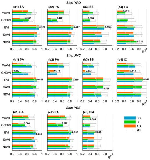 Notably, the EVI time series achieves the highest fitting accuracy (average: 0.802) in 9/11 cases emerging from within each class of salt marsh vegetation at the three study sites. This accuracy is 0.028 higher than that obtained using the followed SAVI time series, and their difference is significant (p < 0.05) for S. alterniflora and P. australis at the three study sites (see Table 4). In contrast, the GNDVI time series has the lowest fitting accuracy (average: 0.482) in 9/11 cases. Such inferiority in fitting accuracy is very significant (p < 0.05) for almost all salt marsh vegetation types except T. chinensis in the YRD and S. mariqueter in the YRE. The remaining two cases belong to the WAVI time series, indicating that the latter two VI time series are unsuitable for curve fitting. Concerning the curve fitting method, the DL method exhibits the highest fitting accuracy in 9/11 cases, followed by the TF method. Nevertheless, except for T. chinensis in the YRD, the advantage of the DL method is not significant (p > 0.05) in terms of the average fitting accuracy compared to the TF method (see Table 5). In contrast, the AG method yielded a significantly (p < 0.05) low fitting accuracy of nearly all cases (10/11), especially for S. alterniflora in the JMC, where the fitting accuracy of the GNDVI time series reached only 0.219, which is significantly lower than that obtained using both the DL and TF methods (Figure 6(b1)). These data highlight the necessity of combining both the EVI time series and the DL method (i.e., EVI-based DL model) as this achieves the highest fitting accuracy (average: 0.830 for 8/11 cases), whilst in contrast, the GNDVI coupled with the AG model is deemed highly unsuitable (average fitting accuracy: 0.422 for 9/11 cases).