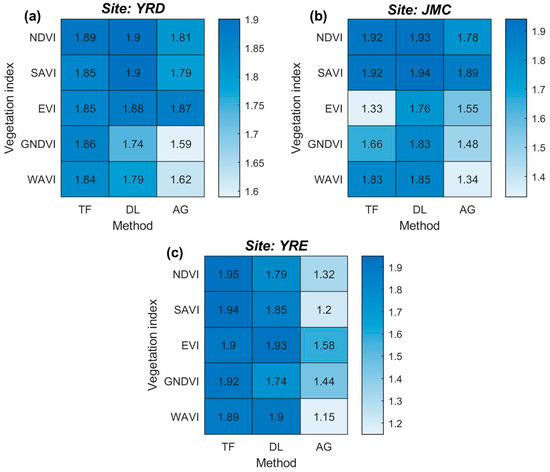 Salt marsh vegetation separability for the different VI time series-based curve fitting model measured by the overall Jeffries–Matusita distance (OJMD). (a–c) The OJMD for different VI time-series-based curve fitting models in the YRD, JMC, and YRE, respectively. Bluer cells equate to a higher degree of separability achieved by the model. Note: (i) the labeled value denotes the OJMD; and (ii) the curve fitting model, AG = Asymmetric Gaussian, DL = Double Logistic, and TF = Two-term Fourier.