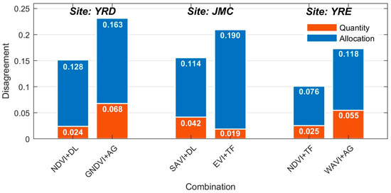 Figure 8 presents the salt marsh vegetation classification map corresponding to the VI time series-based curve fitting model with the maximum and minimum separability for each study site. The classification maps are shown to be highly consistent with the separability results and are therefore accurate. The classification maps corresponding to the models with high separability reliably depict the actual distribution of salt marsh vegetation species, as evidenced by the strong agreement with data from the field surveys (Figure 8(a1–c1,a3–c3)). Conversely, the classification maps corresponding to the models with low separability yield a large number of omission errors (e.g., T. chinensis, see Figure 8(a2,a4)), commission errors (e.g., P. australis is misclassified as S. alterniflora in Figure 8(c2,c4)), and fragmentation (e.g., salt-and-pepper noise related to S. alterniflora is widespread in Figure 8(b2,b4)). More specifically, the allocation disagreement was shown to be the main source of error, having accounted for more than two thirds of the total agreement in each of the models (Figure 9). The most conspicuous difference between the models lies in the allocation disagreement in the JMC, which decreased by 0.076 when the high separability model was used. However, compared with the low separability model, the high separability model has a higher disagreement at this site. In terms of the YRD and YRE, the quantity and allocation disagreements for the model with high separability were uniformly lower than those for the model with low separability. In general, there is a 0.068 difference in the overall accuracy of the classification mapping between high- and low- separability models, representing a decrease in both the allocation disagreement (0.051) and quantity disagreement (0.017). As such, the choice of the VI time series-based curve fitting model has significant implications for the accuracy of salt marsh vegetation classification, highlighting the need for careful model selection.