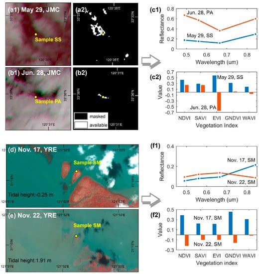 Impacts of coastal environments on the VI time series. Shown are two examples illustrating the errors arising from omitted clouds and shadows: (a1,a2) two Sentinel-2 MSI images (standard false color) with different acquisition dates on the left, and two corresponding SC maps on the right (b1,b2); (c1) spectral curves ranging from visible to near-infrared based for the two samples located in pixels containing omitted clouds/shadows; (c2) values for various VIs based on the two samples; (d,e) two Sentinel-2 MSI images (standard false color) acquired under different tidal flooding conditions; (f1) spectral curves based on the two samples under different tidal regimes; and (f2) values for various VIs based on the two samples.