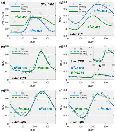 In contrast, sufficient numbers of observations for the JMC and YRE can be obtained in winter but not in summer, owing to the heavy rainy season driven by a moist temperate/subtropical maritime monsoon climate. Besides, substantial fluctuations in VI time series are evident here during the summer due to the larger tidal range for these regions relative to the YRD, and which the DL method typically failed to capture. For example, for S. alterniflora exhibiting a lagged phenological cycle, the DL method presented either a prolonged flat peak or trough (Figure 11e), or a gradual decline during the senescence season as a trade-off for a relatively accurate description of the green-up season (Figure 11f). This is probably because the DL method is not suitable to describe minor fluctuations even though a natural system is being represented and enforces a single peak irrespective of the duration of the flatness at the peak or bottom [32]. In contrast, the TF method exhibits satisfactory performance with S. alterniflora because the Fourier function is flexible in that it alters the phase of function to adequately match the lags in phenology (Figure 11e,f).
