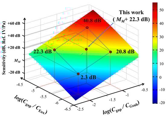 From Equation (5), sensitivity is not determined only by one capacitance value, but instead by the ratio of capacitance (e.g., Cgap/CEox, Cgap/CGsub), which is a dimensionless parameter. This is an interesting aspect of the mechanism. For a conventional MEMS microphone, sensitivity is strongly dependent on the gap capacitance, and therefore on the design trade-off between the sensitivity and cut-off frequency with miniaturization. However, because the sensitivity of ElGoFET transduction is determined by the ratio of capacitance, it is possible to realize high sensitivity even with miniaturization. Although the absolute capacitance value of the sensing capacitance Cgap is decreased due to miniaturization, high sensitivity can be achieved by changing the capacitance ratio. Therefore, the problems resulting from miniaturization can be resolved using ElGoFET transduction.