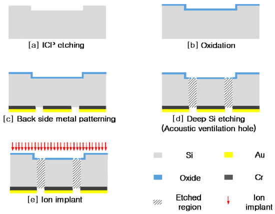 Table 1. The frequency response changed with the number of acoustic holes. Increasing the open area by increasing the number of acoustic holes reduced the thin-film damping effect, as described in Equation (15). For this reason, the number of acoustic holes was set at 12, and the simulated sensitivity was −53 dB. In the low-frequency region, the simulated response did not exhibit the low-frequency roll-off problems typical of MEMS microphones. There was no sensitivity decrease related to the number of acoustic holes in the low-frequency region; rather, a very flat frequency response was observed.