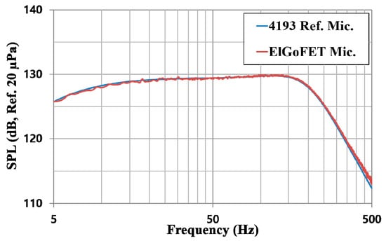 13]. However, in displacement-based ElGoFET transduction, the frequency response in the low-frequency region was not strongly affected by hole resistance. Because the backing fluid resistance change related to the number of acoustic holes was negligible in terms of displacement, a flat frequency response in the low-frequency region was achieved, as shown in the simulation results. Therefore, these data provide theoretical evidence that the ElGoFET displacement sensitive transduction mechanism can effectively overcome the sensitivity degradation problem in the low-frequency region, which eventually results in a flat frequency response over a wide bandwidth, even with miniaturization.