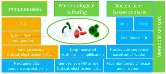 Despite the established reputation in the field, some of their inherent limitations preclude their emergency-use applications. Both microbiological culturing and PCR and FISH are time consuming (from 2 to sometimes 15 h of amplification [] and from 24–72 h to weeks of bacterial growth []). In addition, despite their high specificity, they are still insufficiently sensitive []. In the fastest PCR and FISH, from 103 to 104 CFU mL−1 can be detected [,]. Along with that, errors in PCR amplification and sequence replication and differences in the DNA extraction protocols existing for Gram-negative and Gram-positive strains may result in the wrong quantification of bacterial species [], not to mention the probability of false-positive signals from dead cells, whose DNA can also be PCR-amplified. Amplification inhibition by the matrix components can also contribute to errors in bacteria quantification and therefore detection []. Real-time (quantitative) PCR (qPCR) quantifies amplified bacterial DNA in real-time and may be faster/more sensitive than traditional PCR, but requires fluorescent labels and as such a more complex optical detection equipment []. It may also suffer from matrix inhibitors and dead-cell produced false positives [], though some strategies using intercalating dyes eventually allow to prevent amplification of the dead cells’ DNA [].