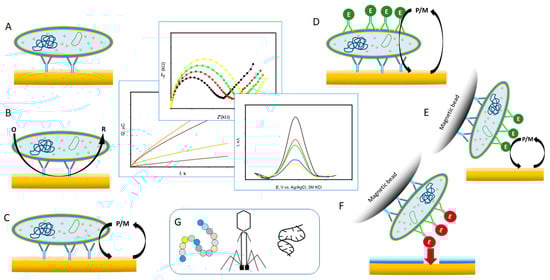 Schematic representation of the typical electrochemical immunosensors. (A) In a label-free and indicator-free immunoassay binding of a cell to the Ab-modified surface is detected impedimetrically; (B) In the presence of a redox indicator cell binding can also be detected voltammetrically or by chronocoulometry. In (C) a redox mediator of cellular metabolism is recycled at the electrode, giving rise to signals associated only with live cells. In (D) a bacterial cell is entrapped in an immune-sandwich formed by two Abs on the electrodes surface and labeled with a redox active enzymatic label, whose activity is electrochemically monitored through its substrate recycling at the electrode surface. (E,F) represent the sandwich assay adaptation to the magnetic beads-format, in (F) redox-inactive enzymatic labels induce changes at the electrode-solution interface that are electrochemically detected. (G) In (A–F) designs elements alternative to Ab can be used: peptides, phages and aptamers.