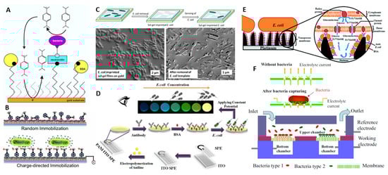 Selected examples of bacterial sensors based on (A) immune-recognition and electrochemical assessment of viable cell metabolism []; (B) Phage-based bacterial cell assay []; (C) Whole cell imprinted polymer sensor based on E. coli imprinting into ultrathin silica films on gold-coated glass slides [], (D) Electro-chromic immunoassay []; and (E) Electrochemical nanopore immunoassay [], and (F) Nanopore e-immunoassay integrated within the microfludic device []. Copyright (2019), (2017), (2019), and (2011) American Chemical Society and copyright (2016) and (2019) Elsevier.