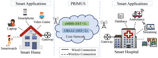 PRIMUS takes into account a network model, as illustrated in Figure 2. The model encompasses the communication between smart devices and environments, such as smart home and smart hospitals, supporting new applications, particularly s-health. In the smart environments, the network infrastructure contains different devices generating network traffic to a gateway by wireless connection (e.g., Wi-Fi, Bluetooth, 5G). The edge devices involve smartphones, augmented reality on video games, laptops, smartwatches from the smart home, ambulance, wearable, and sensors from the smart hospital. We can have usual devices in both smart scenarios, e.g., smartphones. Each device contains applications running on it. PRIMUS receives as input the application identification from our previous work [21]. In the core network, devices involve base stations, routers, switches, and others. Such network model supports network slicing and virtualization techniques (NFV and SDN).