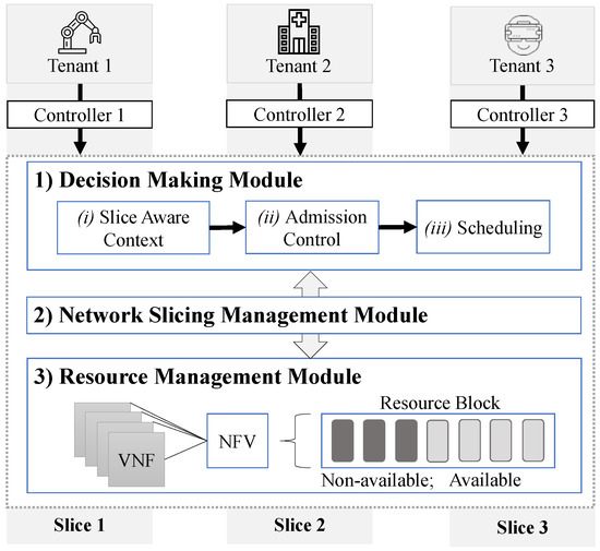 Figure 3 illustrates the PRIMUS architecture that follows the modules: (1) Decision-Making, (2) Network Slice Management, and (3) Resource Management. PRIMUS considers the application context to create and allocate network slices. Thus, different tenants u (users) generate network traffic. Each one belongs to a use case and demands specific requirements Q. Tenant 1 (), 2 () and 3 () refer to devices from industry 4.0, smart hospitals, and augmented reality, respectively. While tenant requires ultra-low-latency, tenant demands high bandwidth. Hence, PRIMUS needs to monitor the network traffic to establish and control the slice to support the requirements, especially the requirements of s-health. The identification and monitoring of s-health applications follow our previous work [20,21]. Based on the knowledge about the application context, PRIMUS creates the slices routes and adapts resources through NFVs. It enables devices to logically and separately share numerous network services without overloading switches. Therefore, PRIMUS considers the highest virtualization level, coordinating devices, network functions, and resources with greater flexibility. The next subsections detail the three modules of PRIMUS.