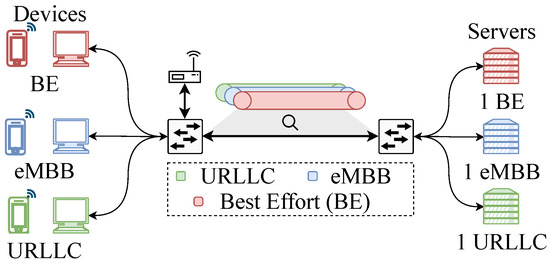The PRIMUS architecture was evaluated on Mininet-WiFi Network Emulator [22] that supports virtualization techniques (SDN and NFV) and network slicing. The emulator runs on the operational system Linux Ubuntu 18.04 LTS over a virtual environment (VirtualBox tool) with Intel Core i7 8500H processor (Santa Clara, California) and 8 GB of RAM. The emulation comprises of an emulated wireless network infrastructure containing two switches, one access point, three wired devices, three wireless devices, and three servers, as shown in Figure 5. The network was virtualized and sliced based on Openflow rules by Libera Hypervisor [23], and the tenants’ slices were managed by ONOS based SDN controllers [50]. The six devices are divided among the three network service/slice types (): URLLC, eMBB, and Best Effort (BE). Each device generates synthetic traffic simulating the specific to a server by iPerf tool v2.0.5 (iPerf Tool: https://iperf.fr/. Accessed on July 2020). One way latency was captured by Python scripts using the Scapy v3.7 library. We call each as its corresponding traffic, i.e., URLLC, eMBB, and Best Effort slices for each bit of traffic.