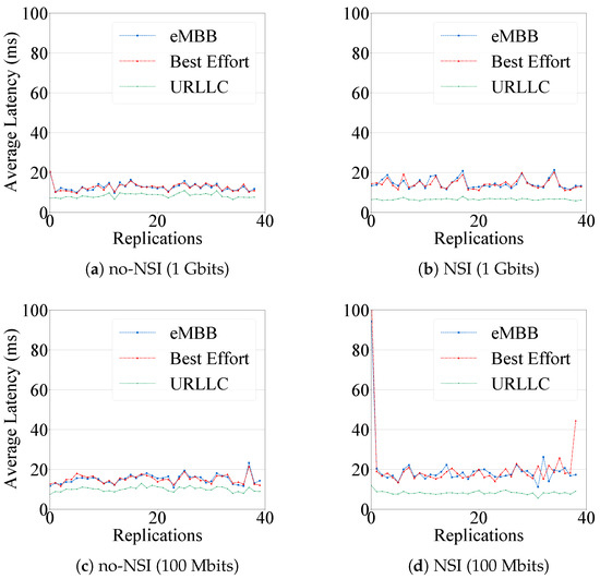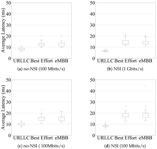 Figure 6 presents the results for latency on both scenarios. Particularly, Figure 6a,b show the average latency with 1 Gbit/s of bandwidth for scenarios with and without network slicing isolation. For all slice types, the latency has reached values around 10 ms and 25 ms since there is enough bandwidth to transmit all network traffic. In the NSI scenario, the URLLC traffic has reached better latency results, such as 8 ms, than in the no-NSI scenario once the first one implements network slicing isolation and priority. eMBB and BE have reached values higher in NSI than in no-NSI. However, they have still presented low-latency values, e.g., 15 ms and 18 ms. Figure 6c,d present the average latency with 100 Mbits/s of bandwidth, i.e., more congested scenarios. The average latency for both scenarios, NSI and no-NSI, achieved similar results as the 1 Gbits/s analyses. However, PRIMUS has achieved lower latency values for URLLC in NSI scenario, such as 5 ms.