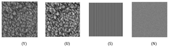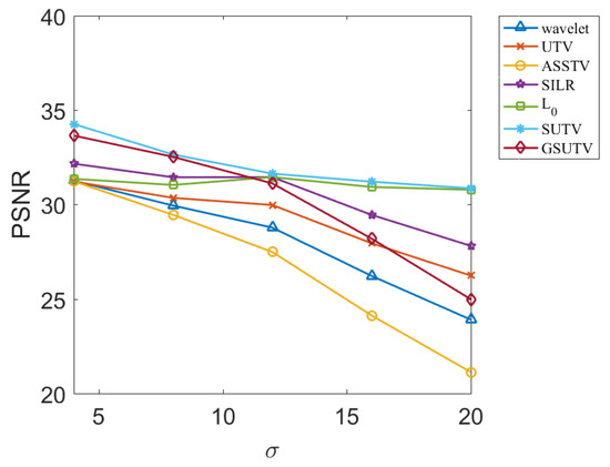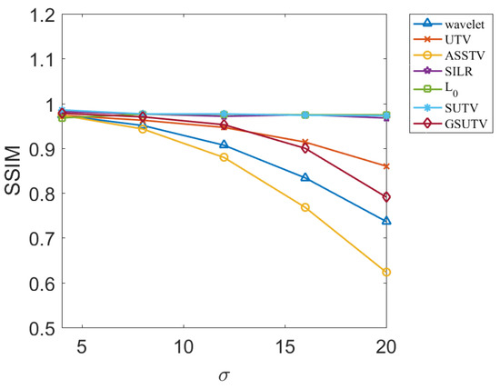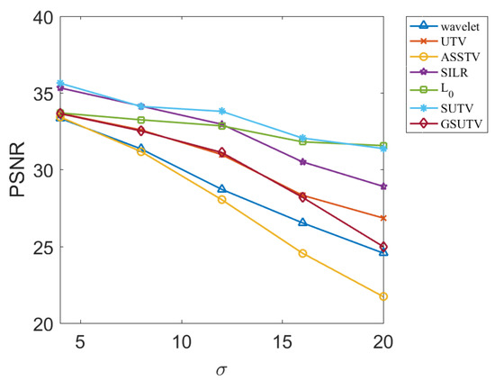 To better show the results of the experiment, we adjusted the gray scale of the original image to [0,255], and zoomed the size of the image to 512 × 512.The standard deviation range of FPN noise is set to [0,20]. This range of choices is based on the PRUN strength of existing consumer CIS and research CIS. For scientific CIS, PRNU is about 0.5%, while for consumer CIS, PRNU is about 2%. Therefore, the [0,20] range we selected fully covers the FPN intensity that we may encounter in general. To fully demonstrate the effectiveness of our proposed algorithm (SUTV), we compare it with the competing methods from both simulated and real data. These competing methods are GSUTV [29], wavelet [30], UTV [31], [32], SILR [33], ASSTV [34] and the recommended SUTV methods in this paper. For the quality assessment of various methods after noise removal, we use subjective evaluation and objective evaluation. In the subjective evaluation, we used the human eye to observe the result after noise removal and Mean Cross-trace curve comparison. In the objective evaluation, we use PSNR and SSIM as two indicators. The non-adaptive Lagrange multiplier involved in our algorithm is determined by hard tuning. The Lagrange parameters involved in other optimum-based competition methods are also adjusted to their optimum state in a hard-tuned way. The Lagrange multipliers in these methods are adjusted when the noise intensity is . The wavelet transform method adjusts the filter threshold to the optimal value when the db7 base wave and three levels of wavelet decomposition are involved.