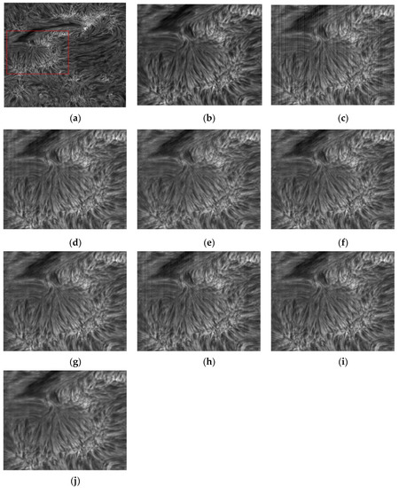 When , the sun’s photosphere image and the denoising results of various methods. (a) Noise image; (b) Local area of clear image; (c) Local region of noise image; (d) wavelet; (e) UTV. (f) ; (g) SILR; (h) ASSTV; (i) GSUTV; (j) SUTV.