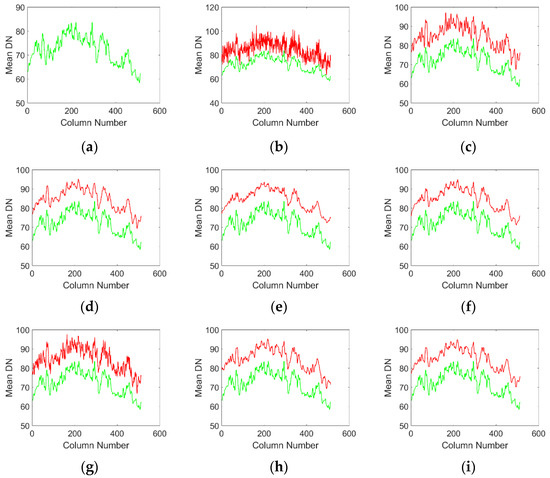 Mean cross-track curves of various denoising results, where the green curve in each result is the mean cross-track curve of the original image, and the red curve is the mean cross-track curve of various denoising results. (a) Original picture; (b) Noise image; (c) wavelet; (d) UTV; (e) ; (f) SILR. (g) ASSTV; (h) GSUTV; (i) SUTV.