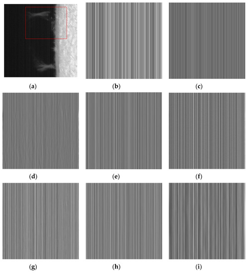 The difference image is the difference between the noise image Y and the filtered result U. The performance of various methods for extracting stripes and whether the difference image contains the structure information of the original image can be clearly observed from the difference image. By observing the difference image in Figure 4, it is found that there are inaccurate estimates of the stripes in Figure 4d,g, and it is obvious that the structure information of the original image is left behind in their difference image. In Figure 4c, although a regular difference image is extracted, the difference image is significantly different from Figure 4b. From the stripe transformation trend, the overall transformation trend of Figure 4e,f,h,i is similar to that of Figure 4b. After careful discrimination, we can also find that Figure 4i is very close to Figure 4b in both trend and intensity of change. In terms of our subjective judgment. Figure 4i has the best fringe extraction effect.
