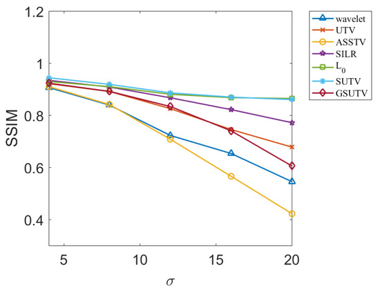 Next, we objectively evaluate the noise removal performance of each method through two evaluation indexes, PSNR and SSIM, which are relatively objective. PSNR and SSM results for various methods at different image and noise intensities are shown in Figure 9, Figure 10, Figure 11 and Figure 12.