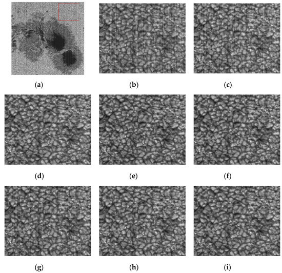 For the analysis of sunspots in Figure 13c,d,g shows that there is a clear stripe noise almost on the whole image. Figure 13e,f,h removes almost all of the noise except for slightly striped residues in the black area in the middle. The denoising result Figure 13i of the method we recommend is the most thorough one of all. No residual noise stripes can be seen on the whole image.