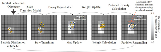 The occupancy grid map is an important representation model in the mobile robot environment mapping application, proposed by Moravec and Elfes [23]. This model divides the environment where the robot is located into several neat grids and extracts the status of each grid to determine the environmental accessibility. In recent years, the FastSLAM method based on the occupancy grid using a laser range sensor has been widely applied in the field of robotic navigation. This method uses a laser range sensor to perceive the external environment and estimate the occupancy grid map of the environment. By utilizing the constructed map, the algorithm can effectively correct the positioning error of the robot. However, considering the size and cost of laser range sensors, it is not suitable for pedestrian positioning applications. For this reason, this paper proposes to construct a virtual range sensor using the inertial odometer information to sense the accessible area in the environment and construct the occupancy grid map to deal with the accumulated error of the inertial odometer.