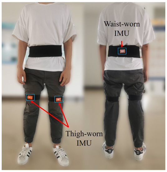To validate the application effect of the proposed inertial pedestrian occupancy grid-based FastSLAM, several different experiments were conducted on different testers. As illustrated in Figure 7, three MTw (Xsens) inertial measurement units were attached to the pedestrian’s thighs and waist. The six-axis inertial data of each sensor were output at a sampling frequency of 100 Hz. The inertial information was recorded in a laptop during the test and post-processed by the software developed in MATLAB environment according to the algorithm presented above.