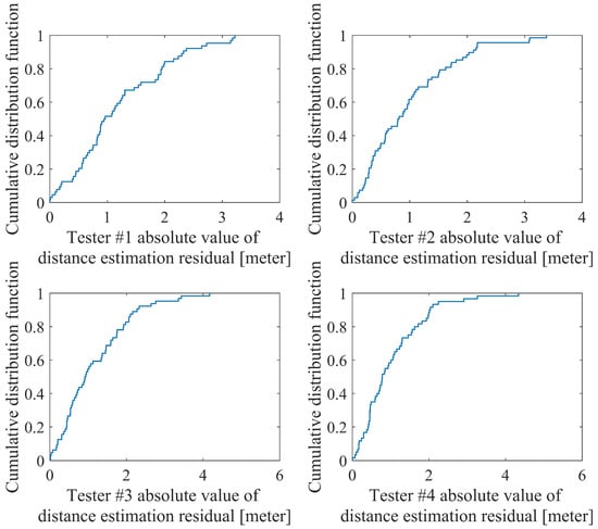 The cumulative distribution function of absolute value of distance estimation residual.