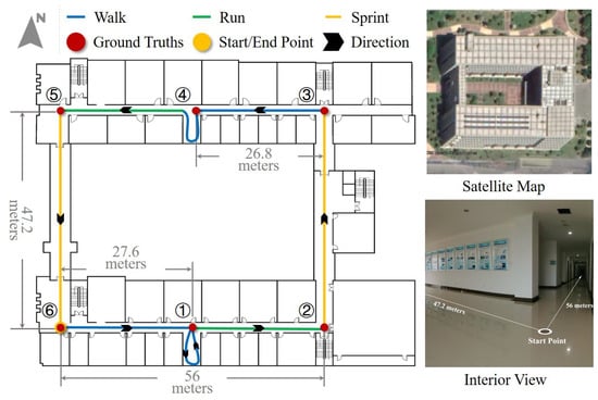 In order to evaluate the occupancy grid-based FastSLAM for inertial pedestrian navigation algorithm, the indoor experiments were conducted in a rectangular area of the building in Nanjing University of Aeronautics and Astronautics. As shown in Figure 9, the route is 1083.5 m long and includes two-room walking path. The starting position and ending position are the same point. We select six turners with prior position information as ground truth points to assess the pedestrian position error. Testers were asked to move along the pre-established route five laps in hybrid motion modes, including normal walking, running, and sprint, as illustrated in Figure 9. In this test, 500 particles are selected, and the edge length of the grid is 2 m.