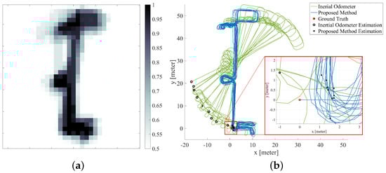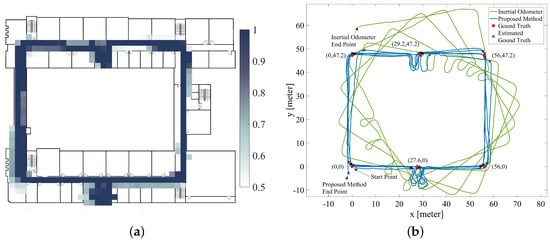 Figure 10a presents the estimated occupancy gird map using the proposed method. The colored grid is the normalized result of the sum of the probability maps carried by all the particles, with white indicating the probability that the grid is passable is 0.5, and dark blue indicating the probability that the grid is passable is 1. Figure 10b compares the estimated trajectory from the inertial odometer (blue line) and the estimated trajectory from the proposed SLAM method (green line). It should be noted that the green curve is the expected distribution of all particles at each moment, rather than the final posterior distribution of all pedestrian pose sequences as shown by most SLAM methods. In other words, once time t is experienced, the expected position in the graph at time t will not change due to the subsequent optimization process. The reason we do this is that in most scenarios the user is most concerned with the accuracy of navigation at the moment. The expectation of posterior distribution of posture at all final moments after optimization has a smaller error than the above method, which may mislead the researchers’ evaluation of the navigation system.