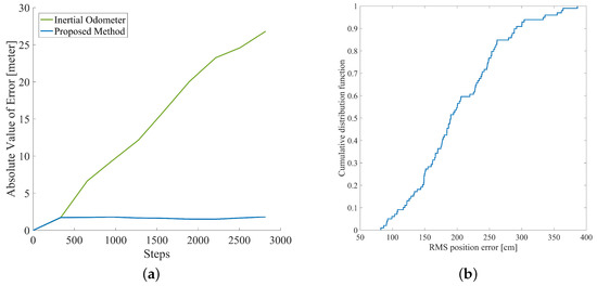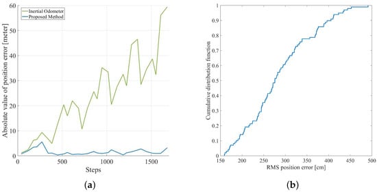 (a) the absolute value of position error of inertial pedestrian odometer and inertial pedestrian odometer integrated with occupancy grid-based FastSLAM; (b) the RMS position error cumulative distribution of inertial pedestrian odometer integrated with occupancy grid-based FastSLAM.