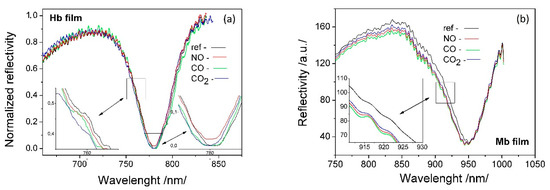 It is interesting to evaluate to what extent the observed differences in the FTIR spectra (Figure 3) are related to the bioactivity of the deposited Hb/Mb films. For this purpose, the bonding of carbon monoxide (CO), carbon dioxide (CO2), and nitric oxide (NO) to the corresponding Hb/Mb functional groups were studied by SPR. Figure 4 shows the spectral shift of the plasmon resonance resulting from the binding reaction between NO (700 ppb), CO (500 ppm) and CO2 (1000 ppm) and Hb/Mb molecules. The details regarding SPR set-up and registration were the same as those previously reported by us [29,30].
