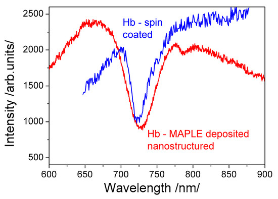 In previous publications of ours we reported that MAPLE is a very promising method in this aspect [29,30]. Our preliminary results proved the feasibility of MAPLE for direct Hb/Mb immobilization—we showed that the main functional groups of proteins are present in the deposited film. In [10] we showed the sensing efficiency of directly immobilized Hb, while in [31] we provided supplementary information regarding the immobilization technique.