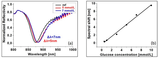 For the purposes of providing convincing experimental evidence of an intact molecule immobilization, we studied the interaction between Hb and glucose. Glucose covalently binds to hemoglobin through the N-end of the Hb molecule beta chain [36] and forms glycated hemoglobin. To study the binding reaction, Hb was directly immobilized on gilded diffraction grating. Figure 7a shows SPR response vs. glucose concentration. The black curve is the resonance of the so-fabricated SPR chip, while the color curves show the resonances at different glucose concentration. The wide spectral width of the resonance limited the sensitivity and accuracy of measurement. Figure 7b demonstrates achieved low detection limit–it is 0.5 mmol/L glucose concentration. The SPR response is evidence of the bioactivity of the Hb molecule beta chain. Since the bioactivity of other functional groups was also experimentally proved, one can conclude that intact direct immobilization was observed.
