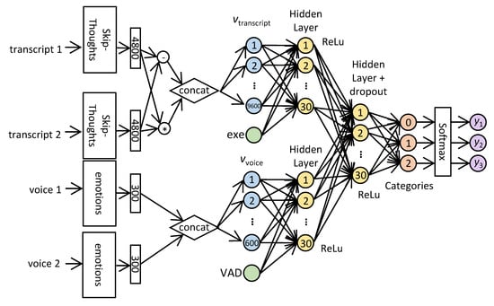 Additionally, SAIF converts the voice commands () into vectors. For this, it uses a model from DataFlair [] for emotion recognition (see Section 2.4 below). Using this pre-trained model, SAIF encodes each voice file into a vector of length 300. SAIF then concatenates the encodings of the two voice commands, obtaining a vector of length 600. To this vector, SAIF appends a feature VAD related to voice activity detection: Using the WebRTC library [], SAIF measures the length of the portion within each sound command which constitutes actual speech. The feature VAD equals the difference . Denote the resulting vector of length 601 by .