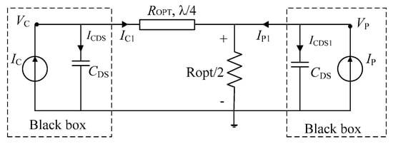 The traditional DPA includes a carrier PA branch and a peak PA branch. At the combiner, there is a load of ROPT/2. A transistor can be equivalent to an ideal current source. The equivalent traditional DPA topology is shown in Figure 1. There is an impedance converter line in the carrier PA branch, as shown in Figure 1. In the analysis of conventional ideal DPAs, the drain-source capacitance CDS is often ignored. In the practical design process, the drain-source capacitance CDS is usually adopted into the output matching circuits to reduce its impact on the performance of the PA.