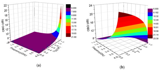 where IC,SAT and IP,SAT represent the saturated current of the carrier and the peak PA, respectively. From Equation (11), the is introduced due to the existence of CDS, which makes the OBO range more flexible in design parameters compared to OBO expression of traditional DPAs. In fact, OBO is also related to output capacitance. Furthermore, we can use different ZCDS to obtain a different OBO. Figure 3 shows the relationships between OBO, coefficient γ, frequency and capacitance. To keep the OBO larger than 6 dB, the capacitance is up to 1.4 pF. In this paper, the DPA with a large OBO range is designed at 3.5 GHz. Therefore, the appropriate capacitance value and coefficient γ can be obtained from Figure 3.