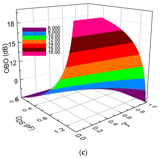 Relationships between output power back-off (OBO), coefficient γ, frequency and capacitance: (a) γ of 0.85, (b) capacitance of 1.22 pF, and (c) frequency of 3.5 GHz.