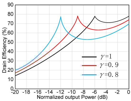 Some power amplifiers for high peak-to-average ratio signals are proposed, such as Doherty [], out-phasing [], and envelope tracking []. Among them, Doherty PAs (DPAs) are widely used in practical base stations because of their simple structure and low cost. However, DPAs also have some inherent disadvantages, such as a narrow bandwidth and only 6 dB output power back-off (OBO) in traditional symmetrical DPAs [,]. It is apparent that a 6 dB OBO cannot meet current communication requirements. In order to extend the OBO range, many methods have been proposed [,,,,,]. In [,], a multiway is applied to extend OBO, which uses multiple peaking PA branches that turn on at various power levels to provide multiple efficiency peaks at and beyond 6 dB OBO. Asymmetrical topology is adapted to ensure the peak PA has a larger saturated current than that of the carrier PA, to increase OBO [,]. However, the multiway and asymmetrical architectures often increase design complexity and under-utilize the power capacity of active devices.