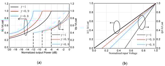 It can be seen that the output power is a linear function of γ. Because γ is less than 1, the output power of the peak PA would decline. For example, γ of 0.91 should be taken for realizing the OBO of 9 dB. At the same time, the output power of peak PA will be 10% less. Different applications would mean a different tendency. So, in practical design, compromise should be made between saturated output power and OBO.