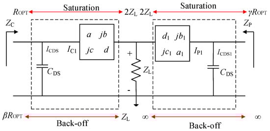 Figure 6 displays the impedance conversion of the DPA at the saturation and OBO level. In this paper, IT is equal to IT1 and they are in phase. In saturation, impedance at the combiner seen from the carrier branch is 2ZL, and the load impedance ZC of the carrier transistor is ROPT. The 2ZL is transformed to ZC by using the (OMN)C and the CDS. At the OBO level, the impedance at the combiner seen from the carrier branch is ZL, and the load impedance ZC of the carrier transistor is βROPT. The ZL is also transformed to βROPT by using the (OMN)C and the CDS. The impedance at the combiner seen from the peak branch is 2ZL, and the load impedance ZP of the peak transistor is γROPT in saturation. The 2ZL is transformed to ROPT by using the (OMN)P and the CDS. At the OBO level, the peak transistor is off, where the impedance ZP is infinite. The impedance at the combiner seen from the peak branch is also ∞. This impedance conversion is also achieved by using the (OMN)P and the CDS.
